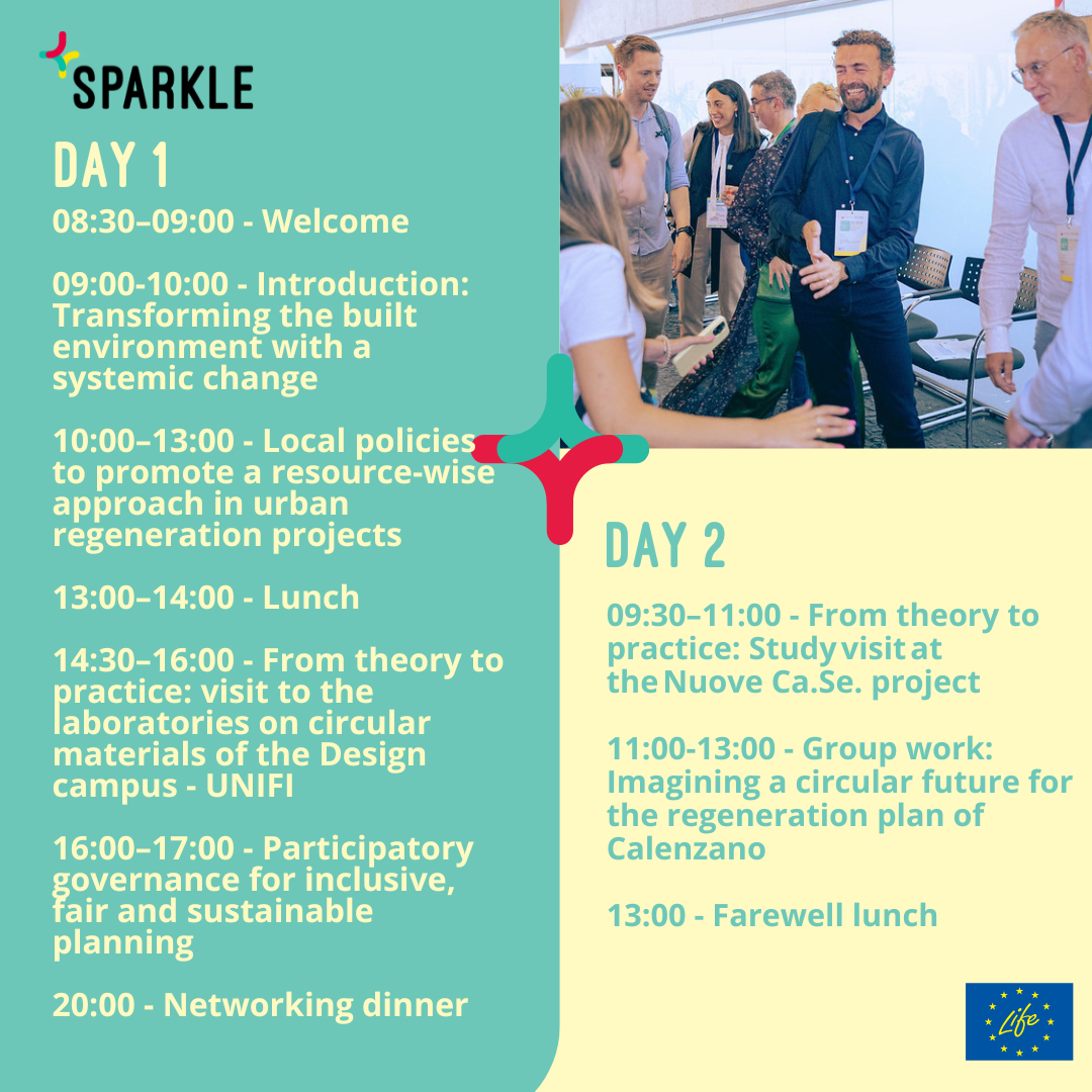 The SPARKLE Calenzano School is designed to deepen your understanding of how circular economy principles can be effectively integrated into SECAPs, particularly in the context of urban regeneration processes.