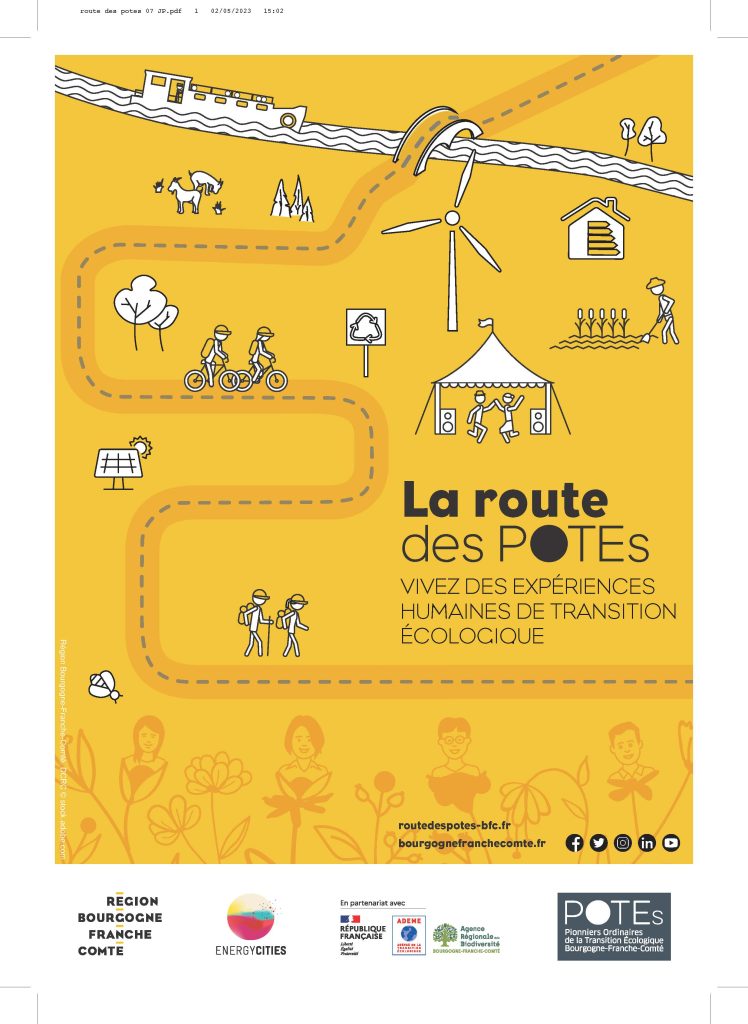 La Route des POTEs est un projet phare du réseau des POTEs qui vise à faire découvrir toute l’année les lieux et initiatives de transition écologiques des POTEs de Bourgogne-Franche-Comté. Il s’agit de les mettre en visibilité pour faire de la transition écologique un atout et faire rayonner notre région, de rendre fiers les POTEs et les habitants de la région. Plus d’une soixantaine de POTEs ouvrent désormais leurs portes au public, chez eux, pour lui faire vivre des expériences humaines autour de la transition écologique et ainsi partager leur savoir-faire, leur histoire et leur passion à travers des activités diverses : atelier pratique, exposition, activité sportive, balade bucolique, festival de musique ou rencontre gourmande, etc.,