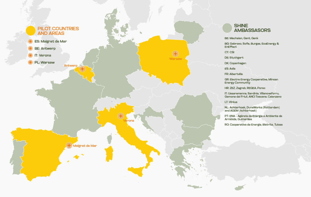 To achieve its objectives, SHINE will initially focus on four pilot areas in four countries, all of which are at different stages in their community energy journey: Belgium (frontrunner), Italy and Spain (Advanced) and Poland (Emerging). They have been chosen as they include a range of different situations: a small coastal town, 2 large cities and a region, reflecting the diversity of European LRAs. What unites all 4 pilots is their ambitions for community energy and their need for support in enabling new projects to happen. They will have replication in 11 additional Ambassador countries.
